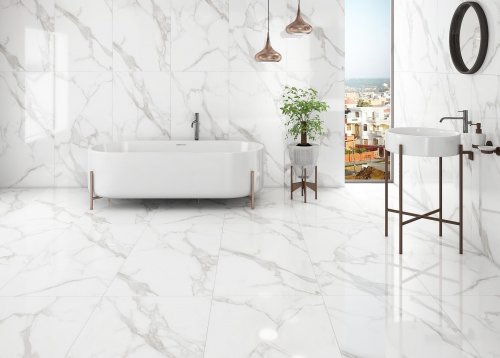 Доступные в голубом, белом и сером цветах, плитки 80x160 см удачно имитируют благородные камни, такие как мрамор, оникс и гранит. Этот продукт сочетает в себе элегантность и практичность, что делает его идеальным выбором для напольного покрытия в любом доме.